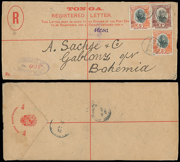 2057 c, entire, etc. imageThe James Teron Collection of Tonga: Postal Stationery: Registered Envelopes: 1906 (Oct. 7) 4d. envelope, 1893 (Apr.) size H2, used from Nukualofa to Karlsbad, Austria (now Czech Republic) bearing 1897 Pictorial 5d. (2) and 1s.. with registration oval at left, Auckland Oct. 10 transit and arrival c.d.s on reverse. H&G 8. Photo. (Image1)