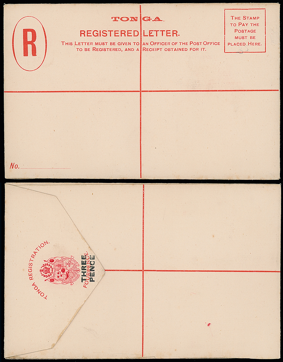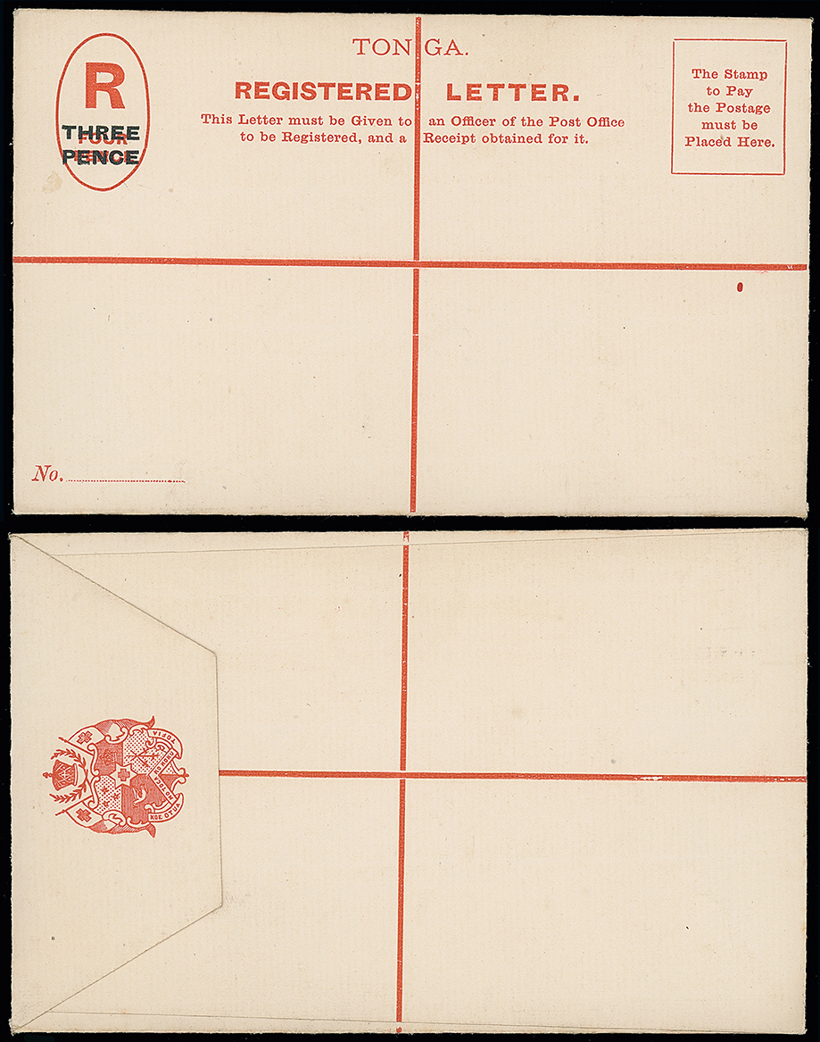 2058 c, entire, etc. imageThe James Teron Collection of Tonga: Postal Stationery: Registered Envelopes: 1908 “THREE/PENCE” on “FOUR PENCE”, surcharge on reverse, size G, unused and very rare. H&G 12. Photo. (Image1)