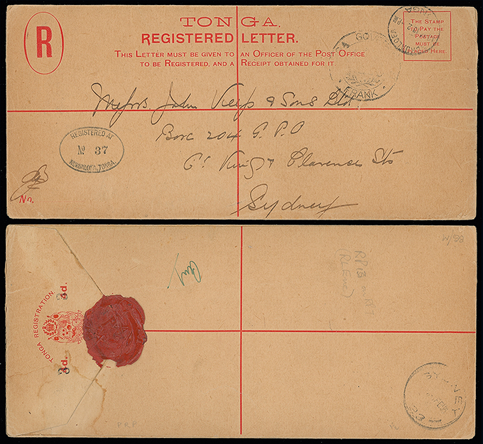2060 c, entire, etc. imageThe James Teron Collection of Tonga: Postal Stationery: Registered Envelopes: 1913 (Jan. 18) 1914 “3” on 4d. size H2, used to Sydney, cancelled by Nukualofa c.d.s., with Tongan frank and oval registration handstamp, with wax seal on reverse. H&G13. Photo. (Image1)