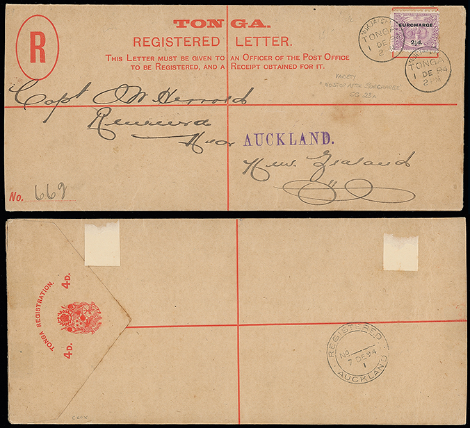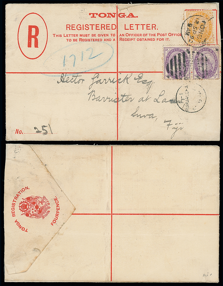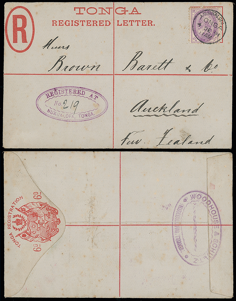 2052 c, entire, etc. imageThe James Teron Collection of Tonga: Postal Stationery: Registered Envelopes: 1894 (Dec. 1) 4d. envelope, 1892 size H2, used to New Zealand, franked by 1894 (June-Nov.) 21/2d. on 8d. mauve with variety no stop, tied by Nukualofa c.d.s’s, with Auckland registered datestamp on the reverse. H&G 8. Photo. (Image1)