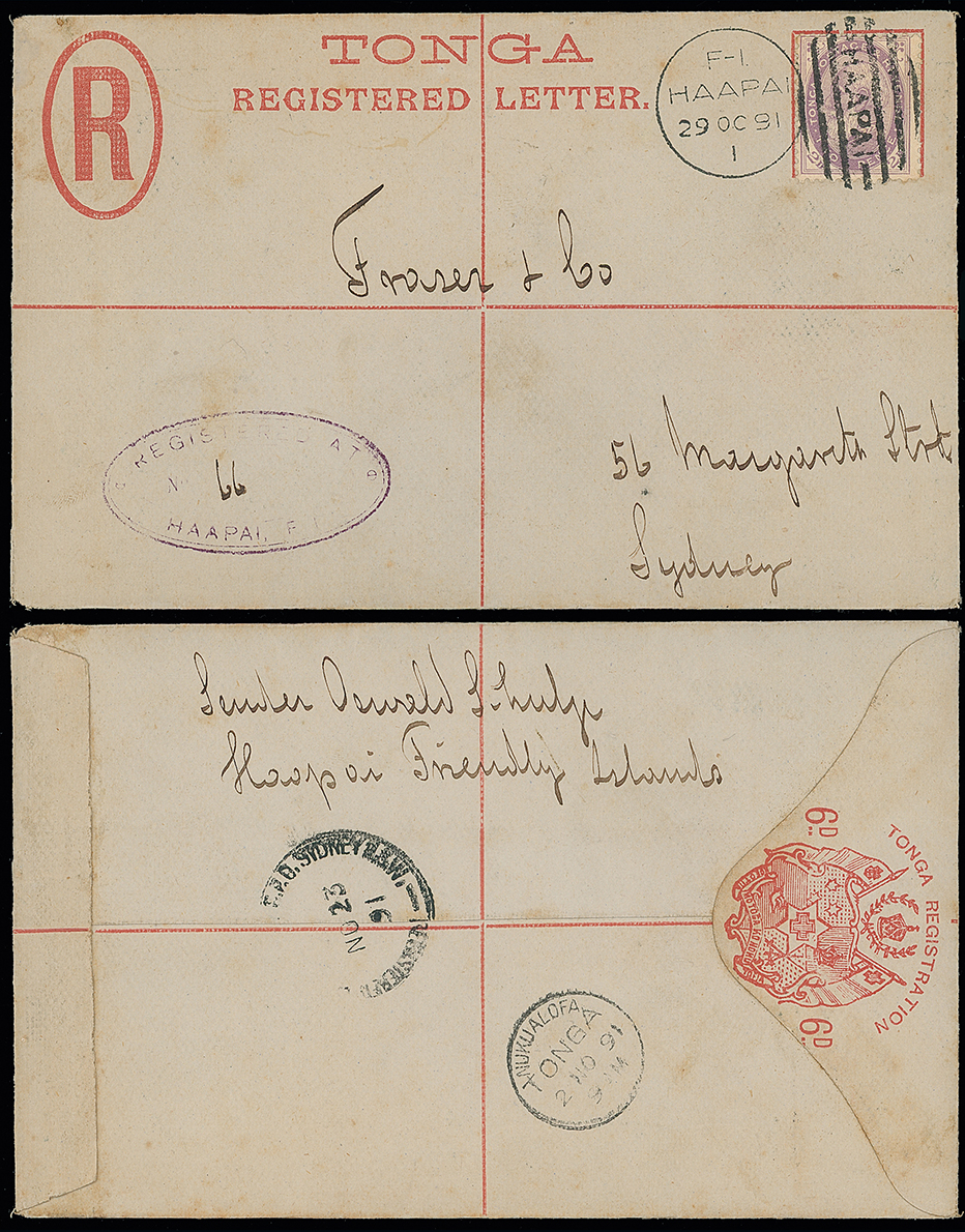2045 c, entire, etc. imageThe James Teron Collection of Tonga: Postal Stationery: Registered Envelopes: 1891 (Oct. 29) 6d. envelope, 1891 size G, used to Sydney bearing 1887 2d. pale violet, perf. 12 x 111/2, tied by “F-I/HAAPAI” c.d.s., with Haapai first type registration cachet (numbered “66” in ms.) at left, with “NEIAFU/VAVAU” Nov. 2 transit on reverse, very slight foxing. H&G 1. Photo. (Image1)