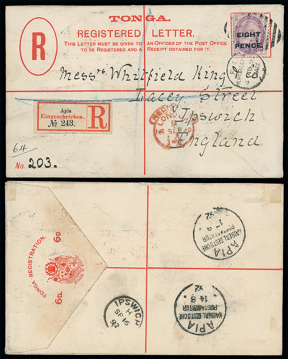 2047 c, entire, etc. imageThe James Teron Collection of Tonga: Postal Stationery: Registered Envelopes: 1892 (Aug. 4) 6d. envelope, 1892 size G, used to England, franked by 1891 (Nov.) 8d. on 2d. violet, tied by Nukualofa duplex, with Apia registration label added in transit, red London registered datestamp, with Apia and Ipswich transit and receiving marks on the reverse. H&G 3. Photo. (Image1)