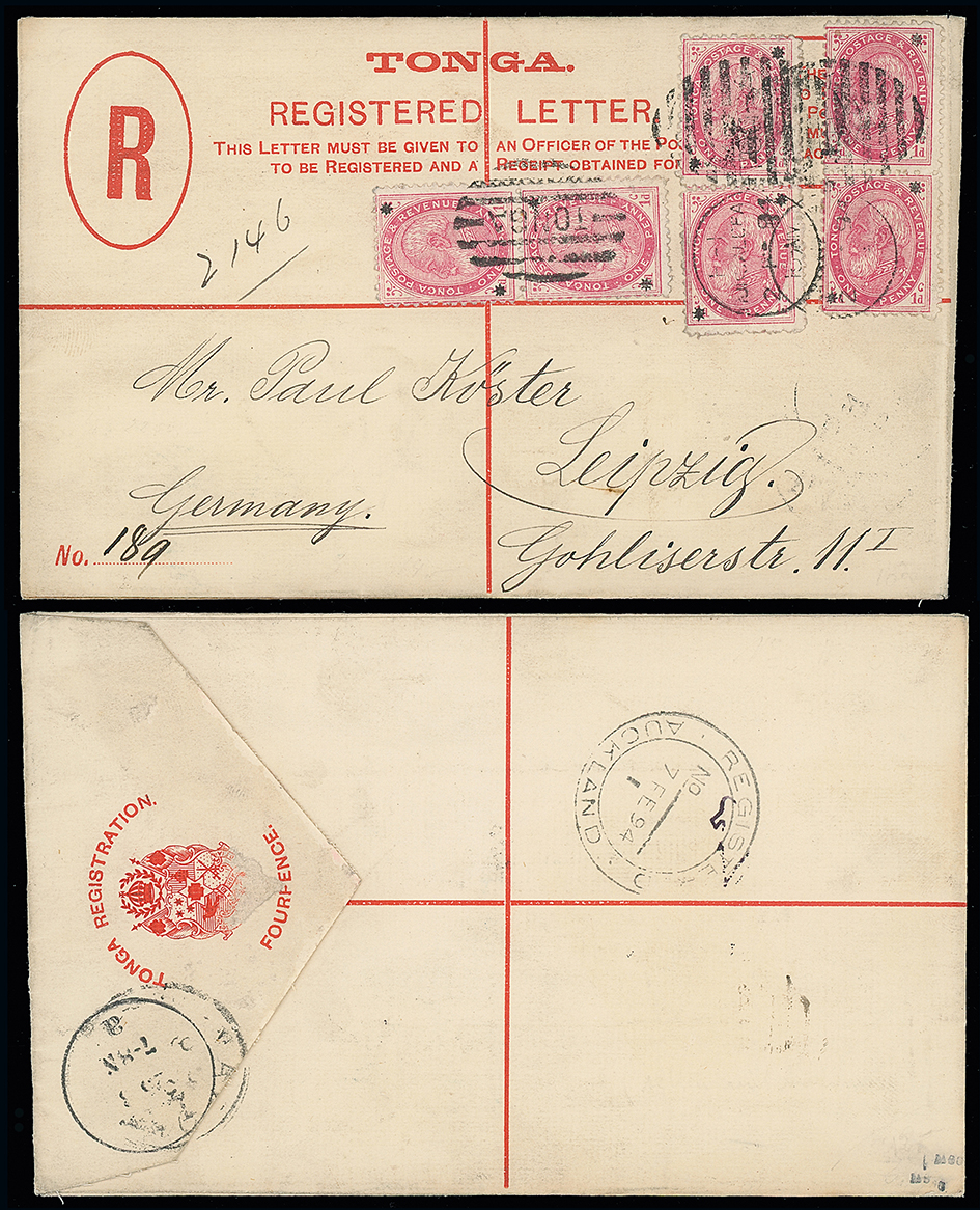 2051 c, entire, etc. imageThe James Teron Collection of Tonga: Postal Stationery: Registered Envelopes: 1894 (Feb. 2) 4d. envelope, 1892 size G, used to Germany, bearing 1891 (Nov.) 1d. (three pairs), tied by Nukualofa duplexes, with Auckland transit and German receiving marks on the reverse. H&G 4. Photo. (Image1)