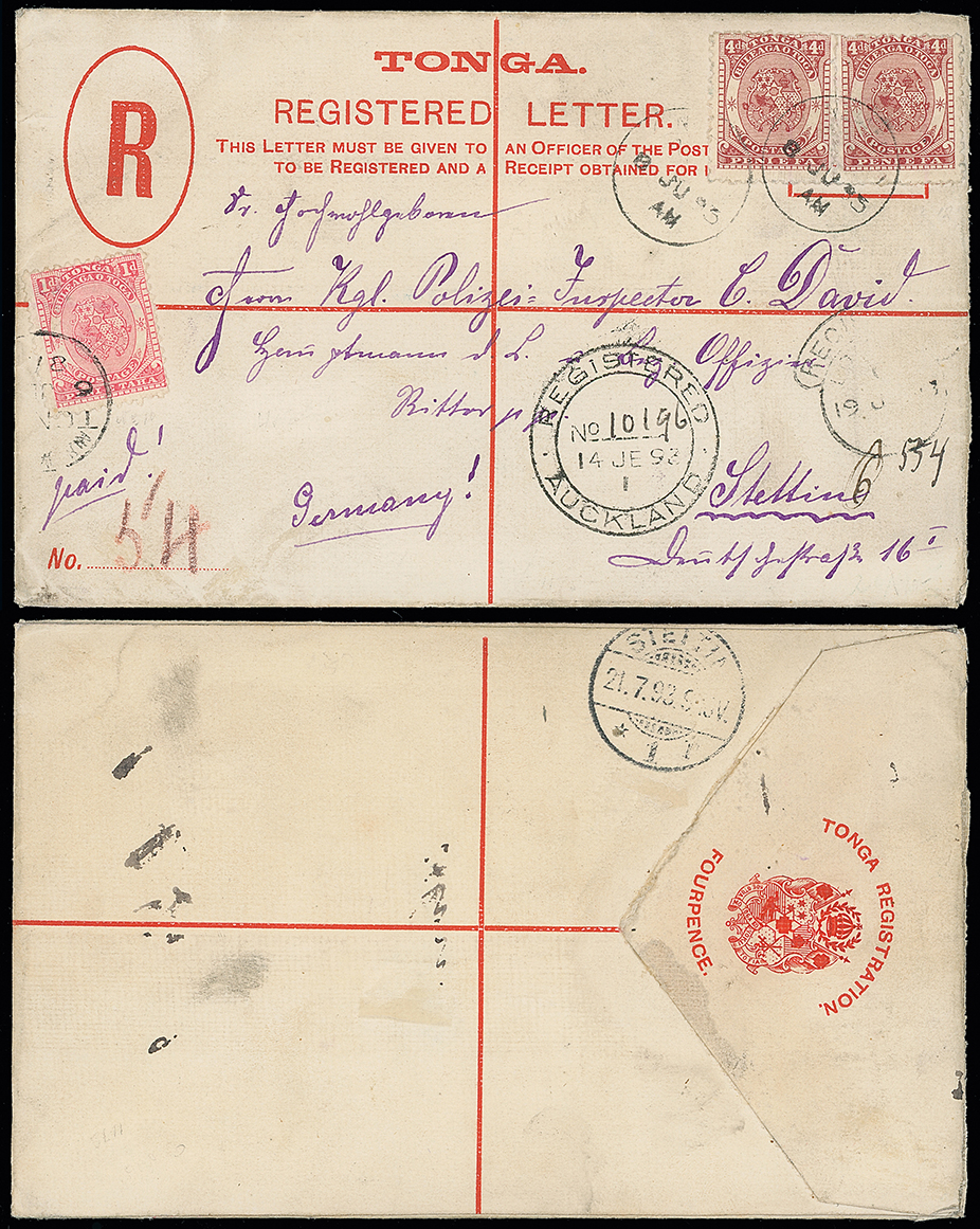 2050 c, entire, etc. imageThe James Teron Collection of Tonga: Postal Stationery: Registered Envelopes: 1893 (June 8) 4d. envelope, 1892 size G, used to Germany, franked by 1892 (Nov.) Arms 1d. and 4d. (2R), tied by Nukualofa c.d.s’s, Auckland and London registration datestamps, with German receiving mark on the reverse. H&G 5. Photo. (Image1)