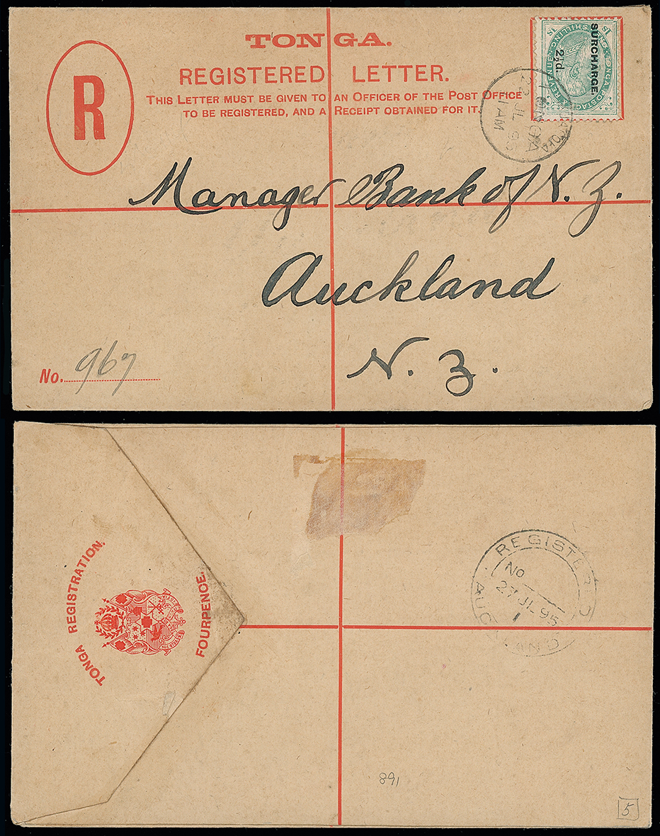 2054 c, entire, etc. imageThe James Teron Collection of Tonga: Postal Stationery: Registered Envelopes: 1895 (July 22) 4d. envelope, 1893 size G, used to Auckland, franked by 1894 (June-Nov.) 21/2d. on 1s. green, tied by Nukualofa c.d.s., with Auckland registration datestamp on the reverse. H&G 7. Photo. (Image1)