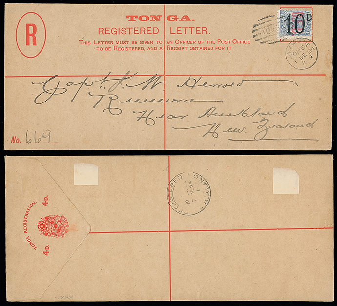 2053 c, entire, etc. imageThe James Teron Collection of Tonga: Postal Stationery: Registered Envelopes: 1894 (Dec. 1) 4d. envelope, 1893 size H2, used to Auckland, franked by Official 1893 10d. on 1s., tied by Nukualofa duplex, with Auckland registration receiving mark on the reverse. H&G 8. Photo. (Image1)