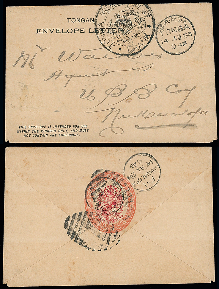2041 c, entire, etc. imageThe James Teron Collection of Tonga: Postal Stationery: Local Stationery, 1891 1d. Envelope Letter: used 1894 written from Vavau to Nukualofa with Tongan Government frank. A most attractive example of a very rare postal stationery item, fewer than ten commercially used items having been recorded. Photo. (Image1)
