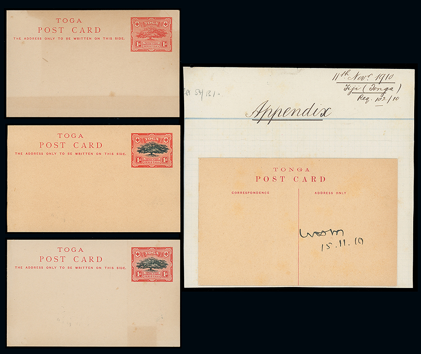 2043 c, entire, etc. imageThe James Teron Collection of Tonga: Postal Stationery: Postcards: 1897 1d. black and red (3) and 1d. red (3) proofs all on different cards, also 1910 proof of postcard, etc. (Image1)