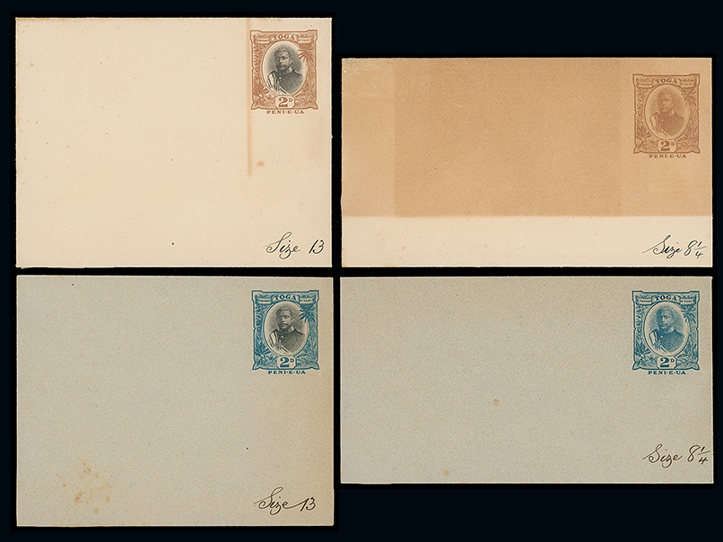 2042 c, entire, etc. imageThe James Teron Collection of Tonga: Postal Stationery: Envelopes: 1897 essays for 2d. envelopes, one in blue, one black and blue marked “Size 81/4” and “Size 13”, 2d. brown and 2d. black and brown marked “Size 81/3”, “Size 13”, some toning. (Image1)