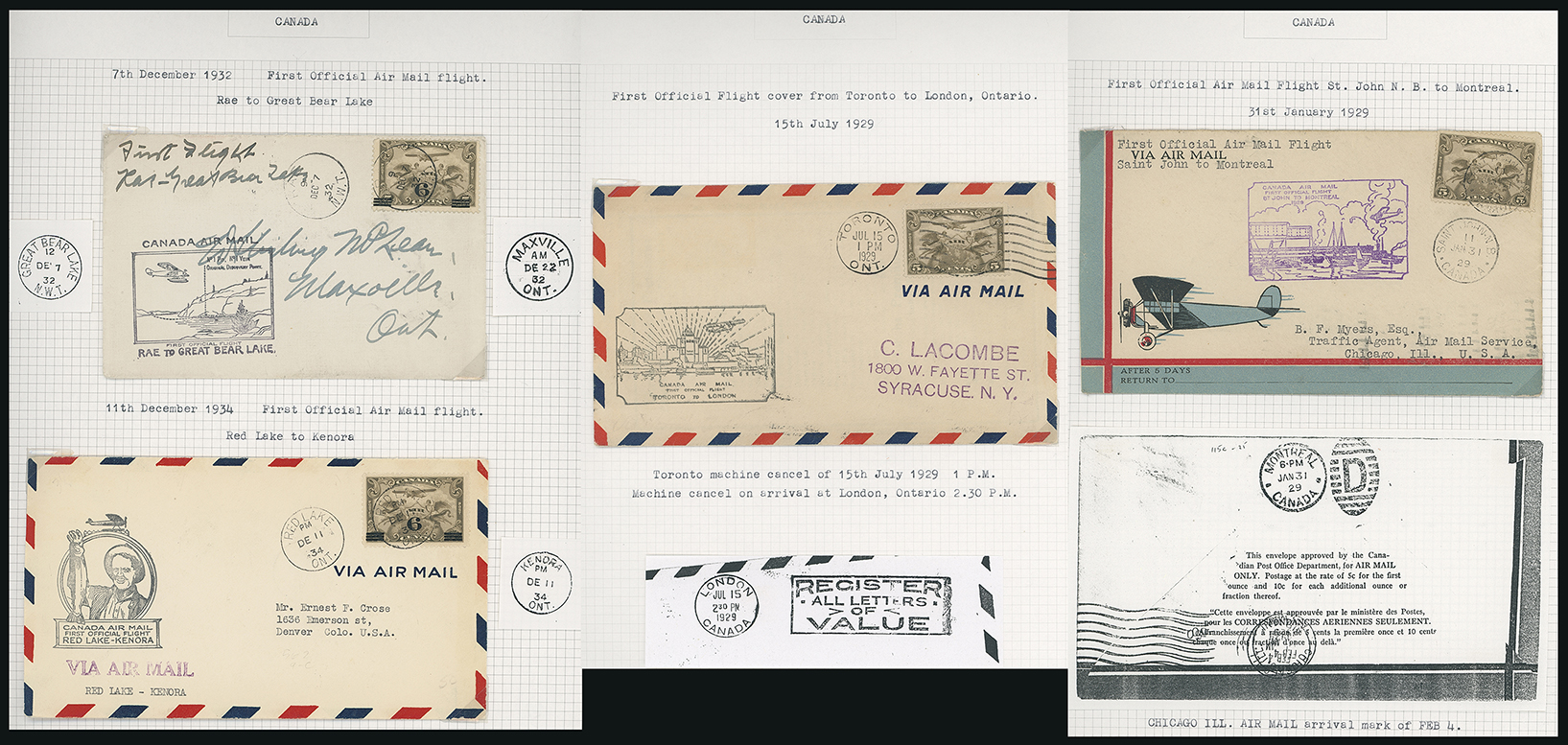 599 c, entire, etc. imageCanada: A collection of first flight covers on leaves incl. various 1928 to 1937 flights, 1949 Vancouver to Hong Kong flight, covers with semi-official airmail stamps incl. Yukon Airways (4), Commercial Airways, Cherry Red Airline, Patricia Airways, Western Canada Airways (2), Newfoundland 1931 three flights, etc. Fine. (31) (Image1)