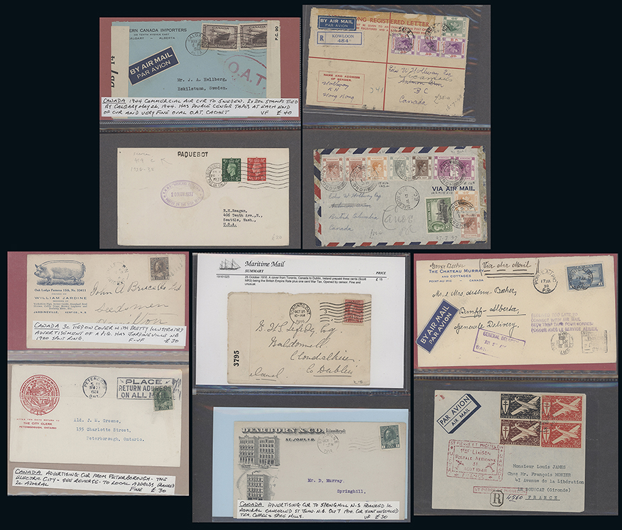 597 c, entire, etc. imageCanada: A collection of K.E.VII to early Q.E.II covers and postcards on leaves incl. advertising covers, airmail, registered items, W.W.I and W.W.II censored covers incl. one with “O.A.T.” cachet, P.O.W. covers (2), maritime mail, postage due mail, official mail, various instructions markings, postal stationery (some unused), incoming mail, also stamps with railway cancellations, Great Britain 1840 1d. Mulready envelope used etc. (approx. 190 covers/cards) (Image1)