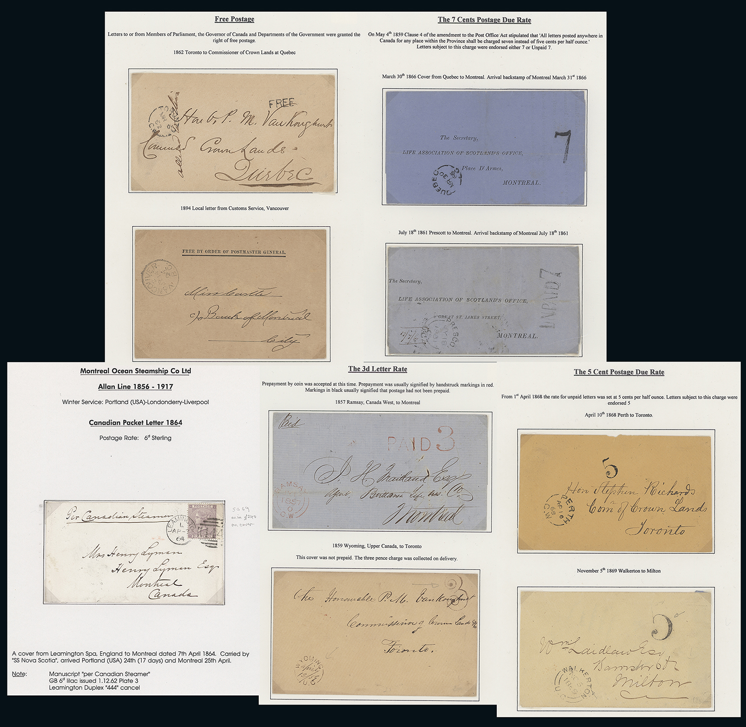 596 c, entire, etc. imageCanada: A collection of Q.V. covers and postcards, some on leaves, incl. pre-stamp mail, trans-Atlantic mail incl. incoming and packet letters, “Free” mail incl. 1899 “House of Commons” cover, registered mail, examples of various rates, unpaid letters with rate marks, postal stationary (some unused) incl. uprated, advertising envelopes incl. 1897 Mulready reproduction to London, 1854 cover to New York with 3d. Beaver imperf. (4 margins), 1888 cover to U.S.A. with 1/2c. Small Queen strip of six, 1902 cover with 1/2c. block of ten, two covers with 1/2c. Small Queen single frankings, 1859 10c., 121/2c. (2) and 17c. single frankings on covers etc., also an old album with extensive duplicated range of 1c. and 2c. used. (380+ covers or cards) (Image1)