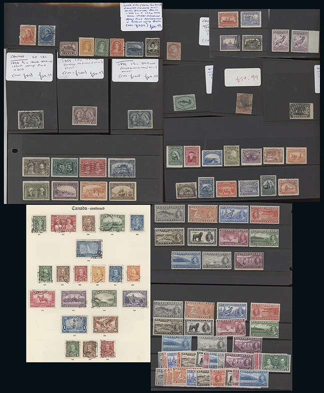 585 imageCanada: Mint and used ranges on stock cards and leaves, from 1860s to 1951, incl. 1893 Widow set used, 1897 Jubilee 1/2c. c.d.s. used and 10c. and 15c. mint, 1908 Tercentenary set, New Brunswick 1860-63 set (less 5c. brown) mint, Newfoundland 1862-64 1s. used, 1865-70 2c. mint, 1887 10c. used, 1897 Discovery set to 30c. mint and 35c. used, 1937 Coronation sets (2), mint, etc. poor to fine. (approx. 190) (Image1)