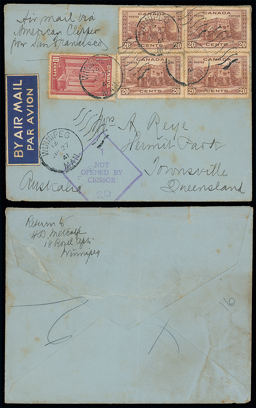 600 c, entire, etc. imageCanada: Airmails, 1941 (Jan. 27) airmail envelope (small faults) “Airmail via/American Clipper/from San Francisco” to Australia franked 10c. and 20c. (4) tied by Winnipeg duplexes and with Australian “1/NOT/OPENED BY/CENSOR/20” mark below. Carried on a Honolulu Clipper Flight 16 which was delayed at New Caledonia following a bubonic plague outbreak. Photo. (Image1)
