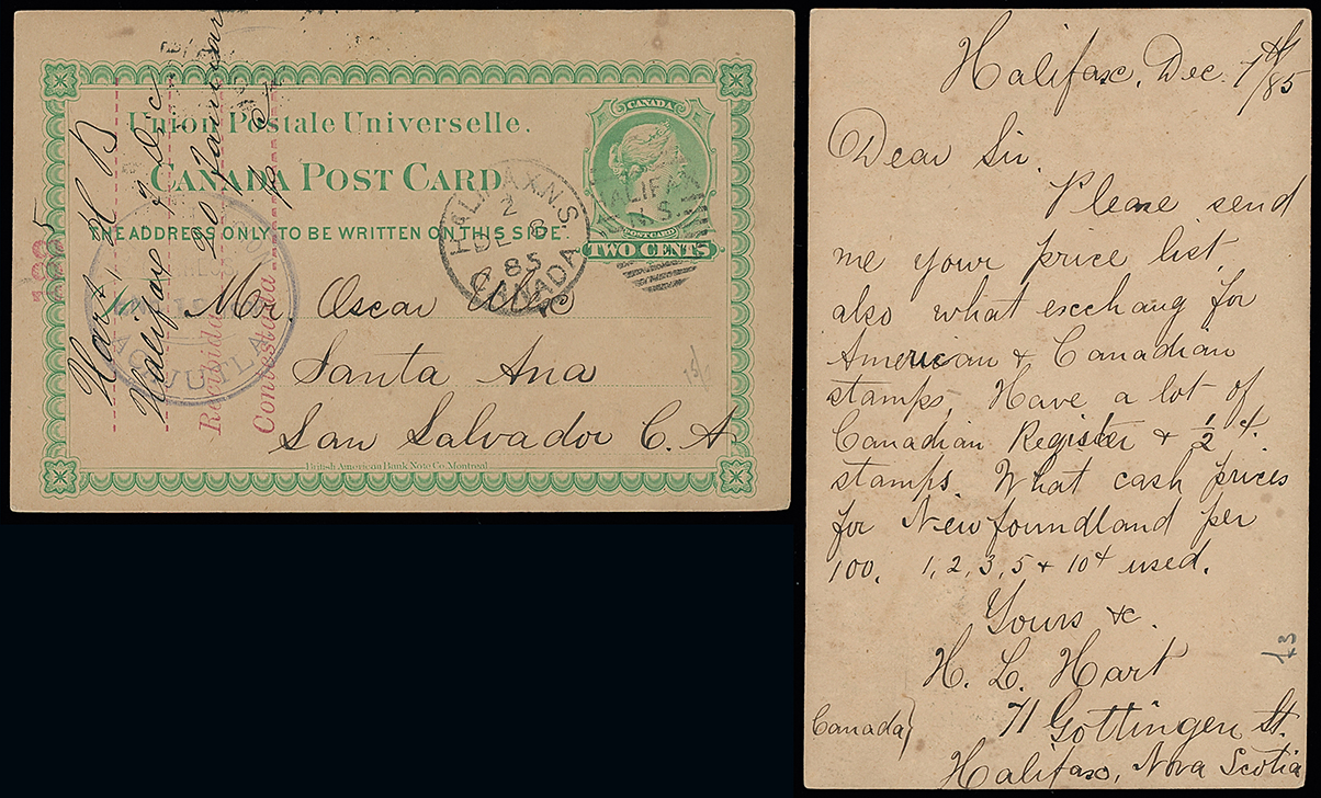 590 c, entire, etc. imageCanada: Postal Stationery: Collection on leaves, in binder and loose in a carton incl. 1885 2c. postcard to San Salvador, 1890 1c. postcard to Antwerp uprated 1c., 1892 2c. postcard to Jamaica, 1893 1c. postcard to Washington with hand-drawn illustration on reverse, 1895 1c. postcard to Dublin uprated 1c., 1899 3c. envelope to U.S.A. uprated 1/2c. (10), 1909-13 1c. illustrated coloured postcards to England, 1922 2c. Admiral postcard showing re-entries in design, 1931 2c. envelope to Helsinki uprated 3c. and 10c. with Pembroke registration mark, etc. (few 100s) (Image1)