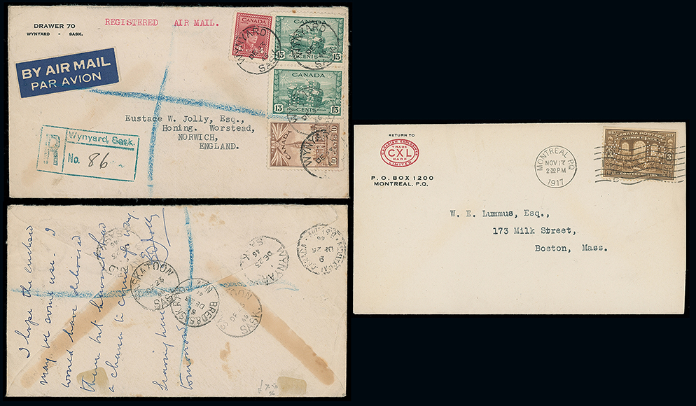 595 imageCanada: Special Delivery: Collection in binder incl. 1898-1920 10c. mint and used (6 incl. with 3c. K.G.V on 1920 cover to Montreal), 1922 10c. mint and used (5, one on a 1929 flight cover to Philadelphia and another with K.G.V 2c. on 1927 cover to Winnipeg), 1927 20c. mint and used (one on 1936 registered cover to England with 5c. and 13c.), 1930, 1932 and 1935 20c. mint and used and on a 1936 airmail cover to New York also franked 6c. airmail, 1938 20c. mint and used (2, one on a 1938 airmail envelope to Sweden also franked $1), 1939 10c. on 20c. mint (8 incl. a marginal block of six) and a few later issues. (64 + 20 covers) (Image1)
