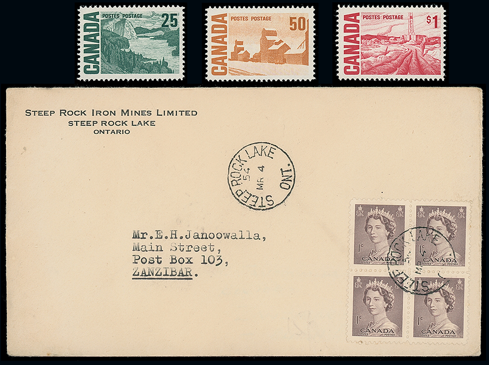 587 imageCanada: Q.E.II various in a small carton incl. 1954 cover to Zanzibar franked 1c. block of four, 1967 set specialised study of fluorescent, hibrite and glazed papers, coils, imprint blocks, booklet panes, Winnipeg and Ottawa tagging bars, 1c. and 5c. pouch panes 6c. mint printed on the gummed side, 1972-85 dollar values in mint blocks, 1953-76 f.d.c. selection, 1959 P.O. stamp souvenir cards, etc. Photo. (Image1)
