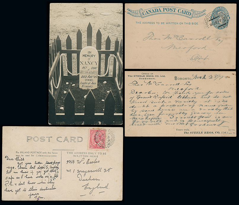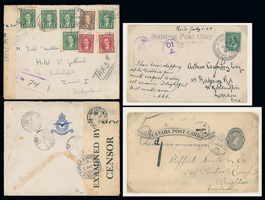 618 c, entire, etc. imageCanada: Cancellations and Covers: Taxed mail, a selection incl. 1897 1c. Jubilee postcard to Ireland with circular “T” and “1d” marks, 1905 letter postcard to U.S.A. franked 1c. not recognised as printed matter and taxed 1908 postcard to London from Ottawa franked 1c. with two rubber circular “T/10” marks, 1942 censored cover to Zurich franked 1c. (5), 2c. and 3c. (2) with manuscript endorsement “TAX 3c.”, etc. (21) Photo. (Image1)