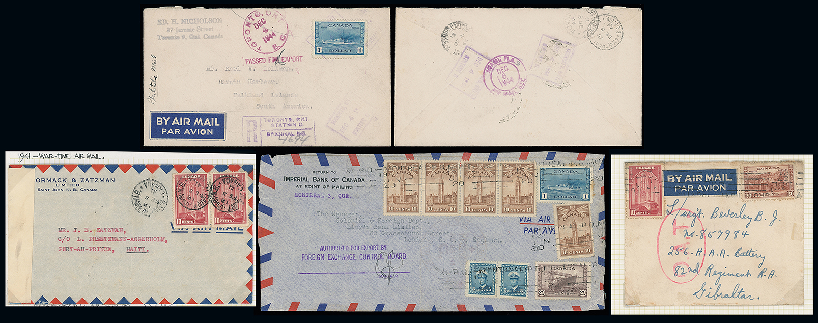 620 c, entire, etc. imageCanada: Cancellations and Covers: World War II, selection incl. 1941 censored airmail cover to Port-au-Prince franked 10c. pair, 1941 airmail cover to Gibraltar franked 10c. and 20c. with oval “O.A.T.” mark, 1941 airmail envelope to London franked 10c., 20c. and $1 with Vancouver registration mark, 1944 airmail cover to Port Stanley franked $1 with Toronto registration mark, etc. (18) Photo. (Image1)
