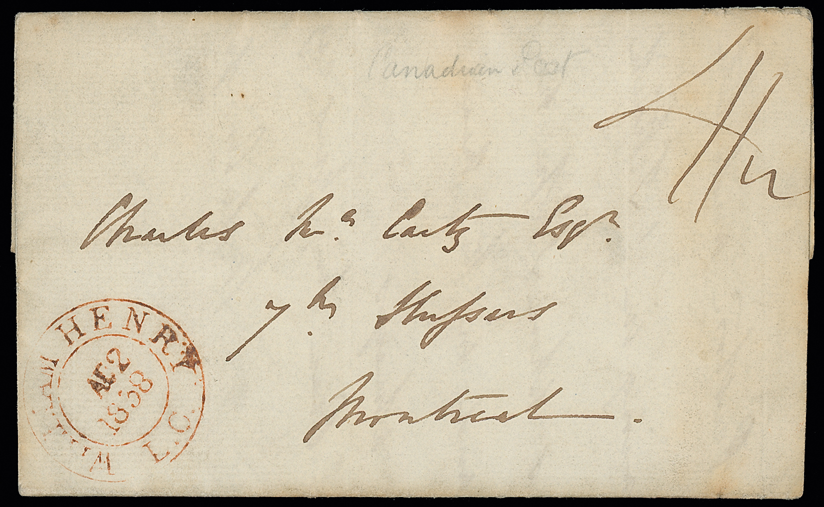 610 c, entire, etc. imageCanada: Miltary, 1838 (Aug. 2) entire letter to a soldier in the 7th Hussars, Montreal with double ring “WIILIAM HENRY/L.C.” c.d.s. and rated “41/2”(d), with references to a visit from the General who has inspected the troops, possibly in connection to the Aroostook War. Photo. (Image1)
