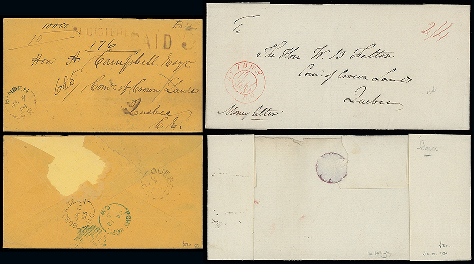 611 c, entire, etc. imageCanada: Money Letter and Registered Mail, a selection incl. 1830 entire to Quebec endorsed “Money Letter” with double ring “BY-TOWN/U.C.” manuscript date c.d.s., 1849 entire to Quebec rated “111/2”(d) with “MONEY-LETTER” mark and “GRANBY” double arc manuscript date datestamp, 1855 wrapper to Southampton endorsed “Money” and “Paid 3d” with “RIVERSIDE/U.C.” manuscript date c.d.s., 1865 envelope to Quebec with “REGISTERED”, “PAID 5” (Jarrett 618e) and “WINDEN/C.W.” c.d.s. showing the wrong year, etc. (9) Photo. (Image1)