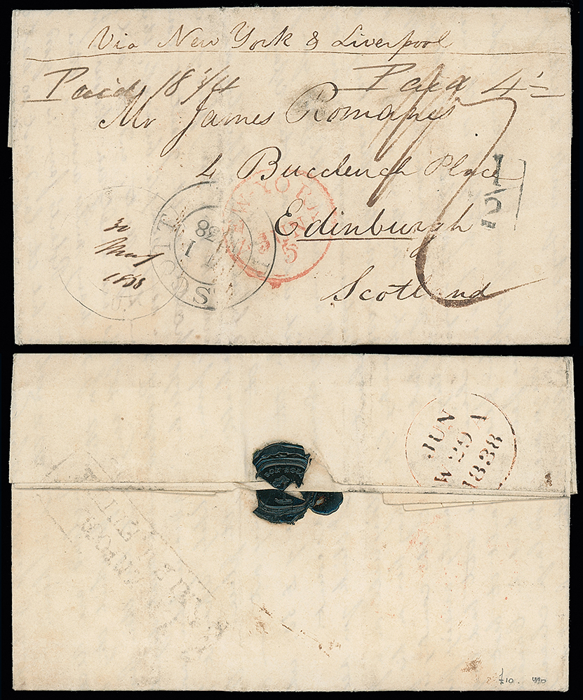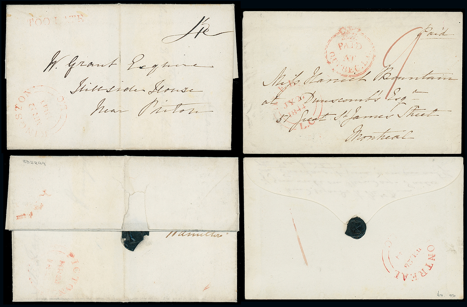 619 c, entire, etc. imageCanada: Transatlantic Mail to Great Britain, selection incl. 1784 wrapper to London datelined at Saint John’s Newfoundland with “PORTSMOUTH/SHIP LRE” and London Bishop marks, 1838 entire to Edinburgh from Elmsley with Prescott and New York transit c.d.s. endorsed “Paid 41/2” and “Paid 183/4”, 1839 entire to London with “HAMILTON/U.C.” New York transit c.d.s., “PAID” mark 1842 entire to London with “ST JOHN’S/L.C.” c.d.s. and rated ‘1/2’(d), 1861 mourning envelope to Newcastle with Montreal Paid tombstone and “PAID 8d Stg” mark, etc. (17) Photo. (Image1)