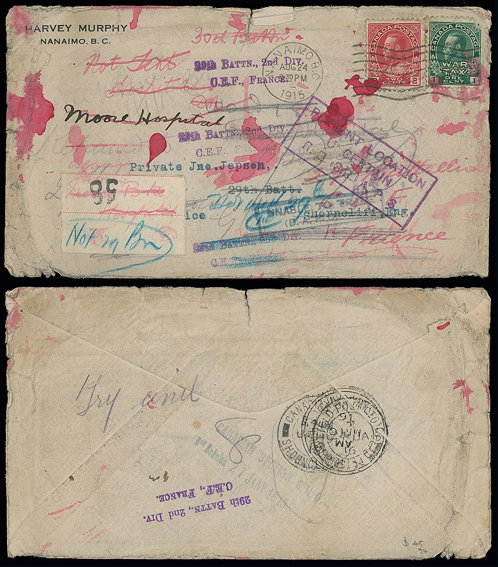 609 c, entire, etc. imageCanada: Cancellations and Covers: Military mail, collection in small carton incl. 1915 envelope to a Private in England multi-redirected to the 29th Battalion of the Canadian Expeditionary Forces, 1917 Field Service postcard to Alberta from the 10th Canadian Brigade in France and Belgium, 1940 envelope to Canada with framed ”CANADIAN ACTIVE/SERVICE FORCE” cachet, 1941 censored P.O.W. lettersheet to Germany with “BASE A.P.O/CANADA” machine cancellation, 1942 censored airmail cover to Canadian Army at Up Park Camp in Jamaica, 1942 envelope to Los Angeles with “RELEASED BY AUTHORITY OF/THE DISTRICT POSTAL CENSOR”, 1943 censored P.O.W. lettersheet sent airmail to Argentina franked 5c. 10c. and 20c. 1943 censored envelope to Canadian Forces Overseas with “REPATRIATED” mark and a Canadian Overseas Postal Deport rubber c.d.s. on reverse, 1944 covers to London or Los Angeles with void or black c.d.s. or machine cancellations with no indication of where posted, 1951 cover to Winnipeg from HMCS ‘Sioux’ in Korea, 1960 envelope to England with “C.E.P.O NICOSIA/C/O H.Q. CYPRUS” datestamp, 1974 envelope to Ottawa from a Canadian Captain in UN Observer Group in Pakistan, 1995 envelope to Winnipeg with United Nations Protection Force cachet etc. (approx. 100) (Image1)