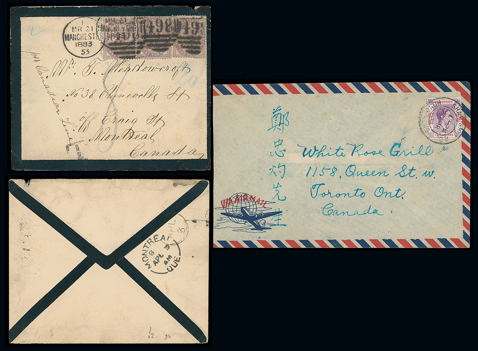 605 c, entire, etc. imageCanada: Cancellations and Covers: Incoming mail, a collection in a binder incl. 1883 taxed envelope to Montreal franked G.B. 1d. lilac (3), 1934 airmail envelope to Toronto franked Brazil 50r., 100r., 200r. (2), 600r.,100r. and $3500 (3), 1940 censored airmail envelope to Toronto franked G.B. 2s.6d., 1940 cover from U.S.A. franked 3c, and 10c. Special Delivery, 1942 censored cover to Montreal franked Uruguay 5c., 1949 aerogramme to Toronto franked New Zealand 6d. (2), 1953 airmail envelope to Toronto franked Hong Kong $2, etc. (approx. 100) Photo. (Image1)