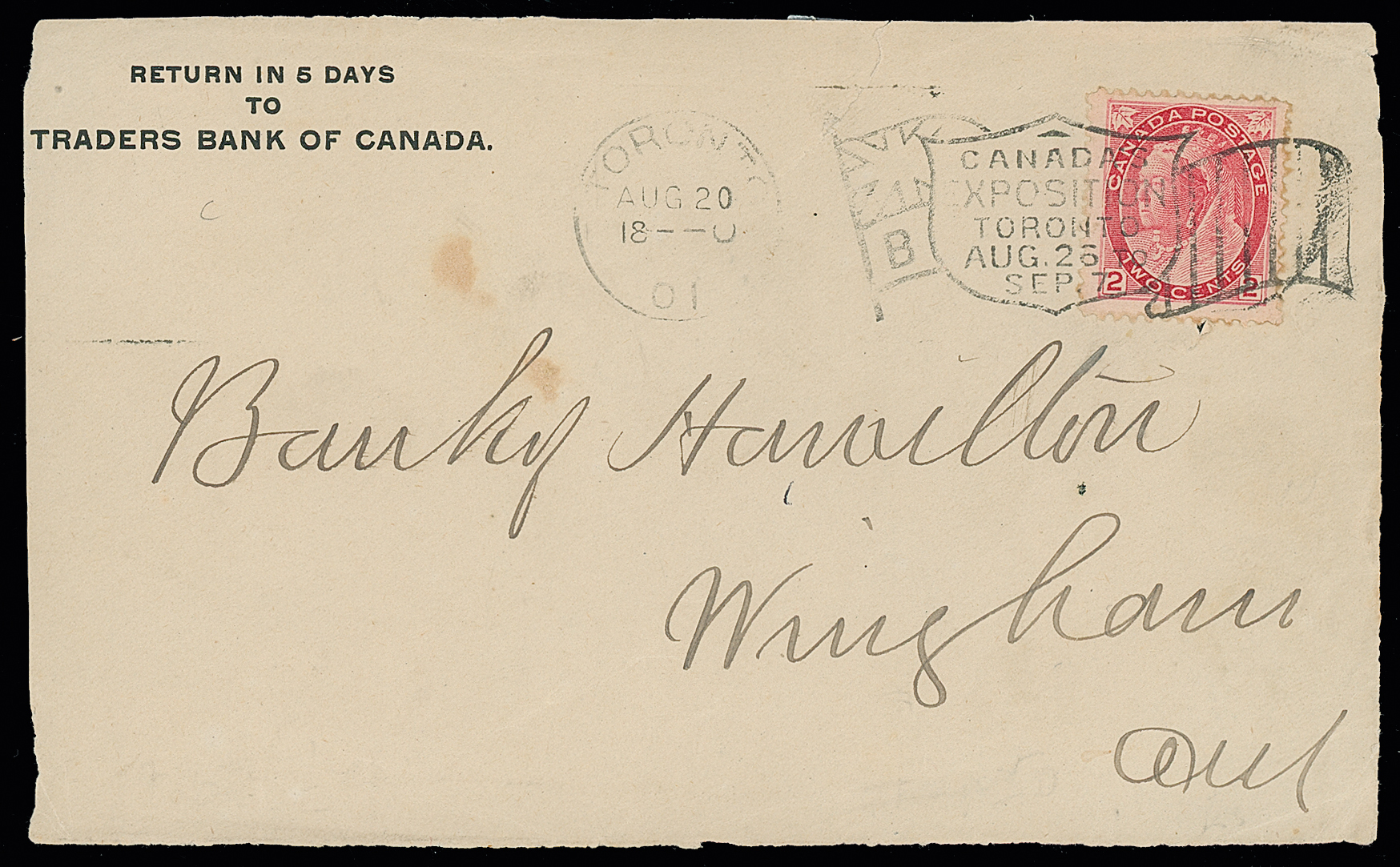604 c, entire, etc. imageCanada: Cancellations and Covers: Exhibitions, a selection incl. 1901 fronts franked 2c. and 1c. postcard with oval or shield types “CANADA’S EXPOSITION/TORONTO” flag Bickerdike cancellations, 1924 (July and Aug.) envelopes with Winnipeg “SECOND ANNUAL CANADIAN/POSTAGE STAMP EXHIBITION” machine cancellations, 1948-61 Edmonton Exhibition Post Office c.d.s., etc. (16 items) Photo. (Image1)