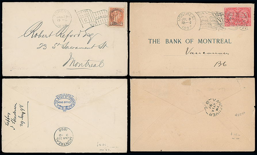 601 c, entire, etc. imageCanada: Cancellations and Covers: Bickerdike Flag Machine cancellations 1896 to 1898, a selection in a binder incl. on covers or postcards with Hamilton type 7 “A” and “B”, Toronto type 7 “A”, “B”, “C” “D” and “F” and type 8 “B”, “C”, “D” and “F”, Montreal type 7 “B”, “C” and “D”, no code (type 7, Die V) and Montreal “1837/VICTORIA/1897” type only in use that year (July 8; early date) and type 8 (Dies I and II), Ottawa (no code) and a 1917 cover to England franked 3c. tied by Halifax slogan and flag machine cancellation. (29 and a few pieces) Photo. (Image1)