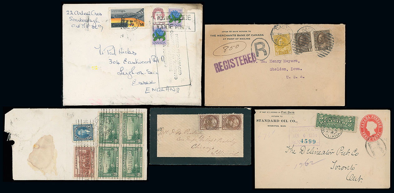 607 c, entire, etc. imageCanada: Cancellations and Covers: Instructional marks, 1940 line-lined parcel tag to Chesterville franked 5c., 20c. and 50c. block of four, 1979 envelope to England franked 1c. (2), 10c. and 14c. with framed bilingual (English/French) “FOUND IN DAMAGED/CONDITION AT TORONTO” cachet, consistent stains and official P.O. explanatory letter, etc. (6) (Image1)