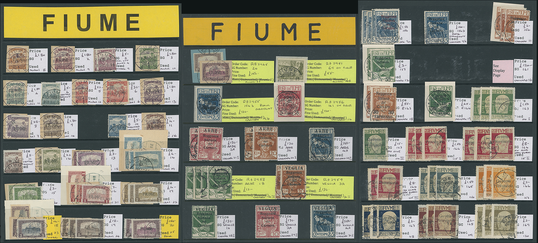 843 imageFiume: A mainly good to fine used duplicated stock on stockcards incl. 1918-19 to 10k. (4), 1919 Second Printing to 10 cor. (2), D’Annunzio 1919 set, Free State 1921 to 10l., postage dues, etc. Not all cancellations and overprints are guaranteed. (few 100s) (Image1)