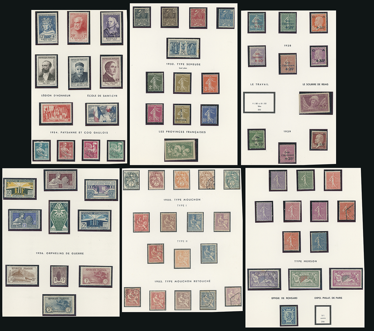 851 imageFrance: A comprehensive mainly mint collection on leaves, 1900 to 1959, incl. 1900 Mouchon type I to 25c. and 30c. mint and type II to 25c. mint, 1925-32 10f. and 20f. Merson mint, 1926-27 Orphans set mint, 1929 set, 1930 1f.50 and 1931 1f.50 Sinking Fund mint, 1936 10f. South Atlantic Flight used, 1950s issues mostly unmounted incl. Relief Fund sets etc. Mainly fine. (100s) (Image1)