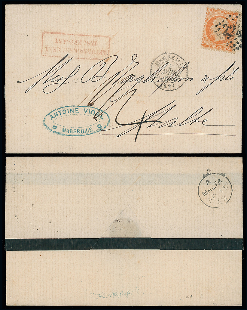 859 c, entire, etc. imageFrance: Cancellations and Covers: Selection with 1849 local entire franked 20c. black, 1863 envelope to Wales franked 40c. with circular “MORE TO PAY” mark, 1868 entire letter to Malta franked 40c. with framed deficiency mark, 1869 registered cover to Edinburgh franked 80c. pair, etc. (20) Photo. (Image1)