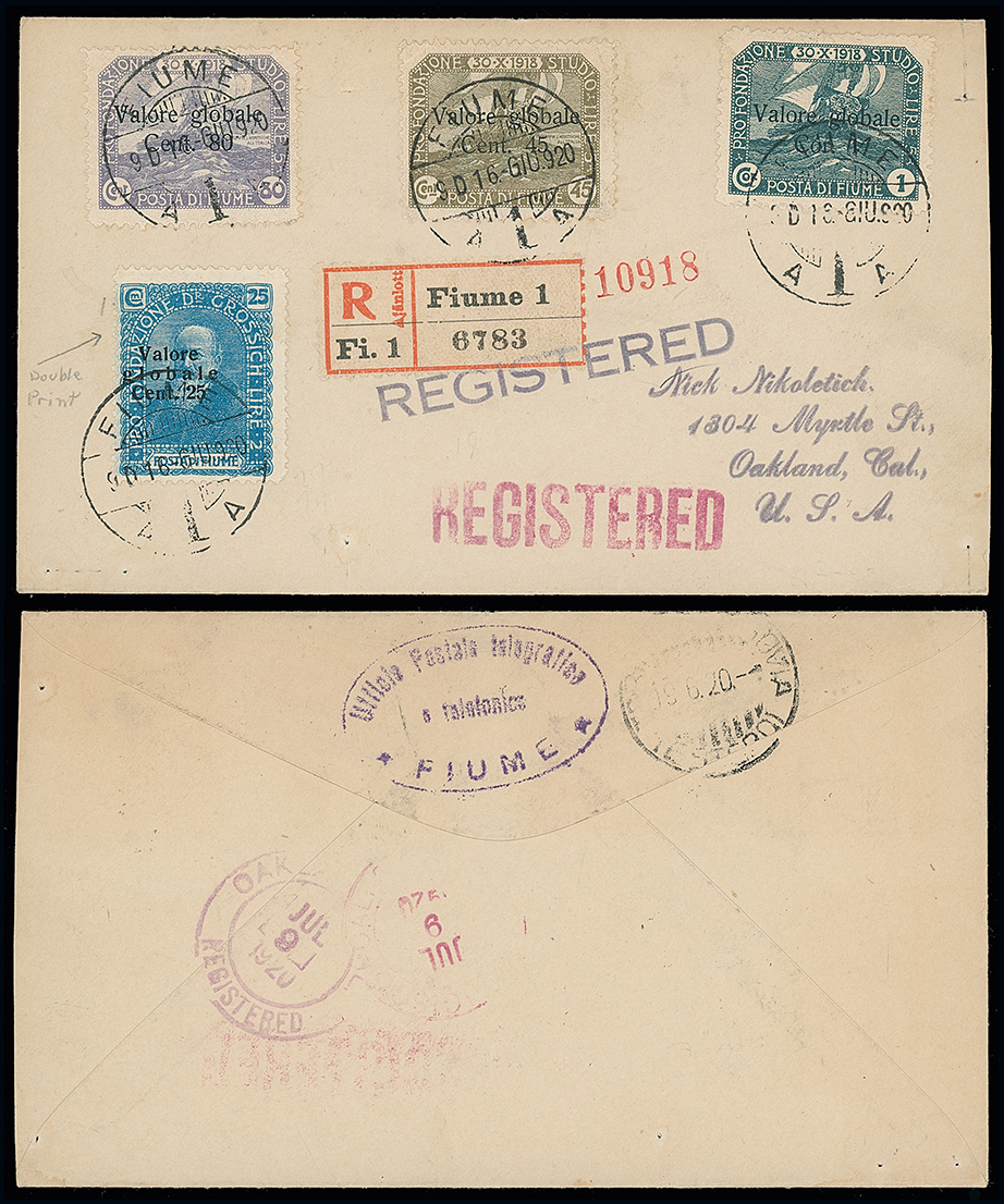 845 c, entire, etc. imageFiume: Cancellations and Covers: 1920 (June 16) philatelic cover to U.S.A. franked 1c., 30c., 25c. (double print) and 45c. with Fiume registration label. (Image1)