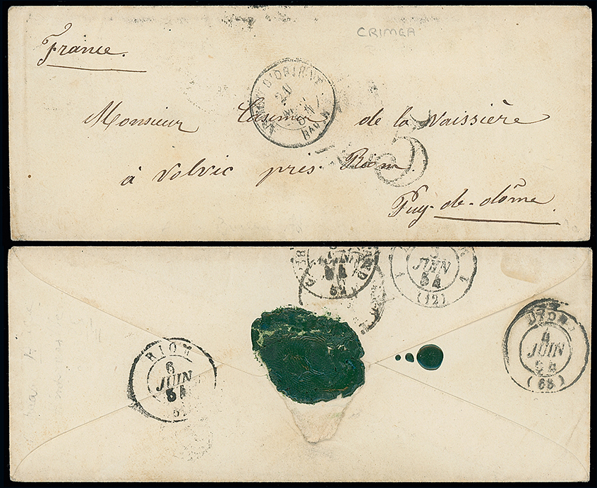 858 c, entire, etc. imageFrance: Cancellations and Covers: Selection incl. 1845, 1860 entires to Buenos Aires, 1854 envelope to France with “ARMEE D’ORIENT” (Crimea) c.d.s. and “25” charge mark, 1861 unpaid wrapper to Stockholm with “72” (öre) charge mark, 1874 unpaid entire to Mauritius with “10d/TO PAY” mark, etc. (9) (Image1)