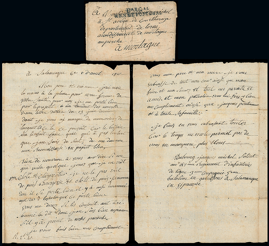 857 c, entire, etc. imageFrance: Cancellations and Covers: 1810 (Aug.) entire letter (fragile in places) to Mortagne-au-Perche, Normandy, written by a soldier during the Peninsular campaign in Salamanca, Spain with two-line “BAUGAL/ARM DE PORTUGAL” mark at top, scarce. Photo. (Image1)
