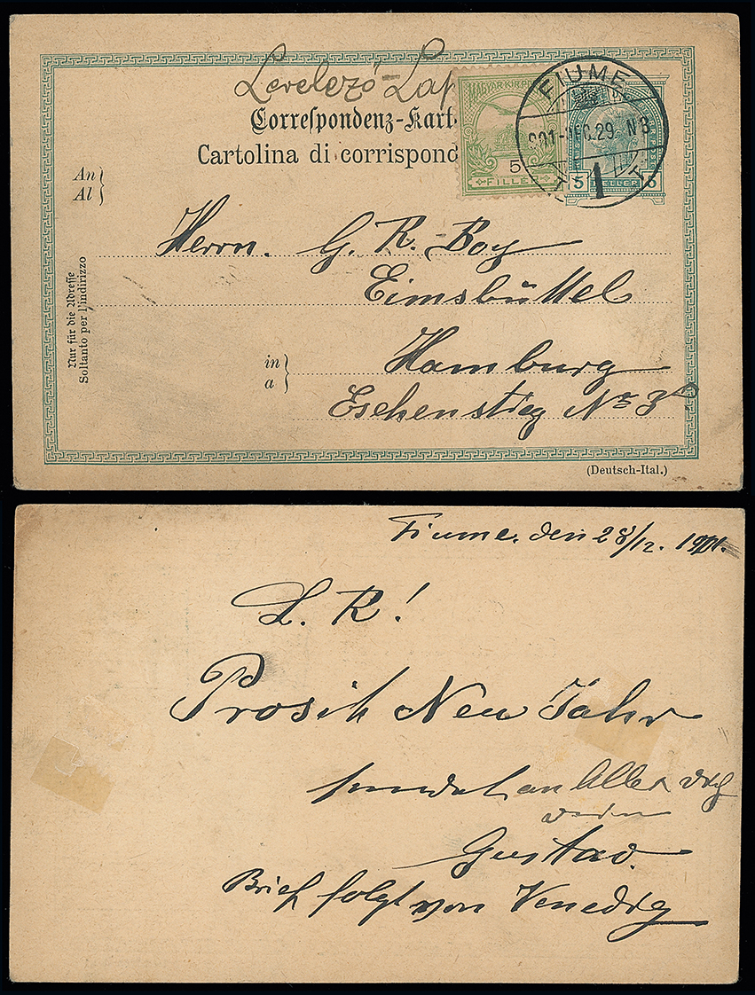 844 c, entire, etc. imageFiume: Cancellations and Covers: 1920 to 1929, small selection with postcards, registered and postage due mail. (5) (Image1)