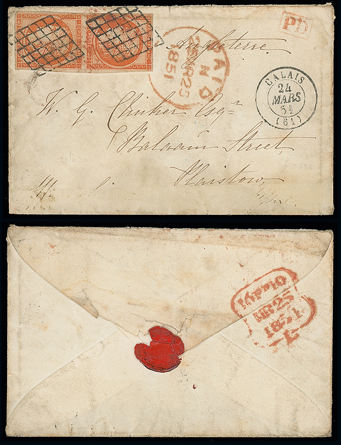 860 c, entire, etc. imageFrance: Cancellations and Covers: 1851 (Mar. 24) envelope (small faults) to England franked 40c. vertical pair, four margins and tied by diamond grid cancellations and Calais and London datestamps and a framed red “PD” mark at top right. Photo. (Image1)