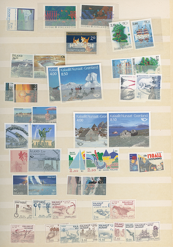 An unmounted mint collection of Scandinavia in stockbook, 1980s and 1990s issues, incl. Aland Is., Denmark, Finland, Greenland, Iceland and Norway, plus some Sweden f.d.c’s, fine condition, stated to cat. £1,682.