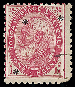 The James Teron Collection of Tonga: 1891 (Nov.) overprinted with stars, 1d. carmine, perf. 121/2 x 111/2, showing three stars, unused, some imperfections, otherwise fine. S.G. 7da, cat. £850. Photo. (Image1)