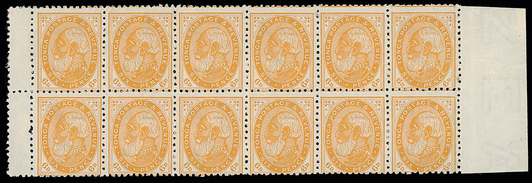 The James Teron Collection of Tonga: 1892 (Aug.) Colour Change, 6d. yellow-orange, unused block of twelve with patchy gum, otherwise fine. S.G. 9, cat. £240+. Photo. (Image1)