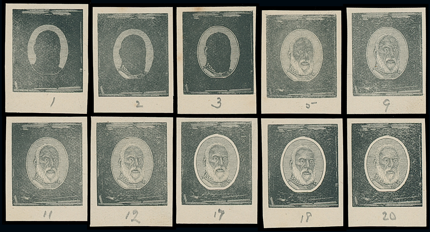 The James Teron Collection of Tonga: 1892 Arms and King George I Issue, ten Progressive Die Proofs of the King George I head vignette with uncleared backgrounds showing progress of engraving, printed in black on