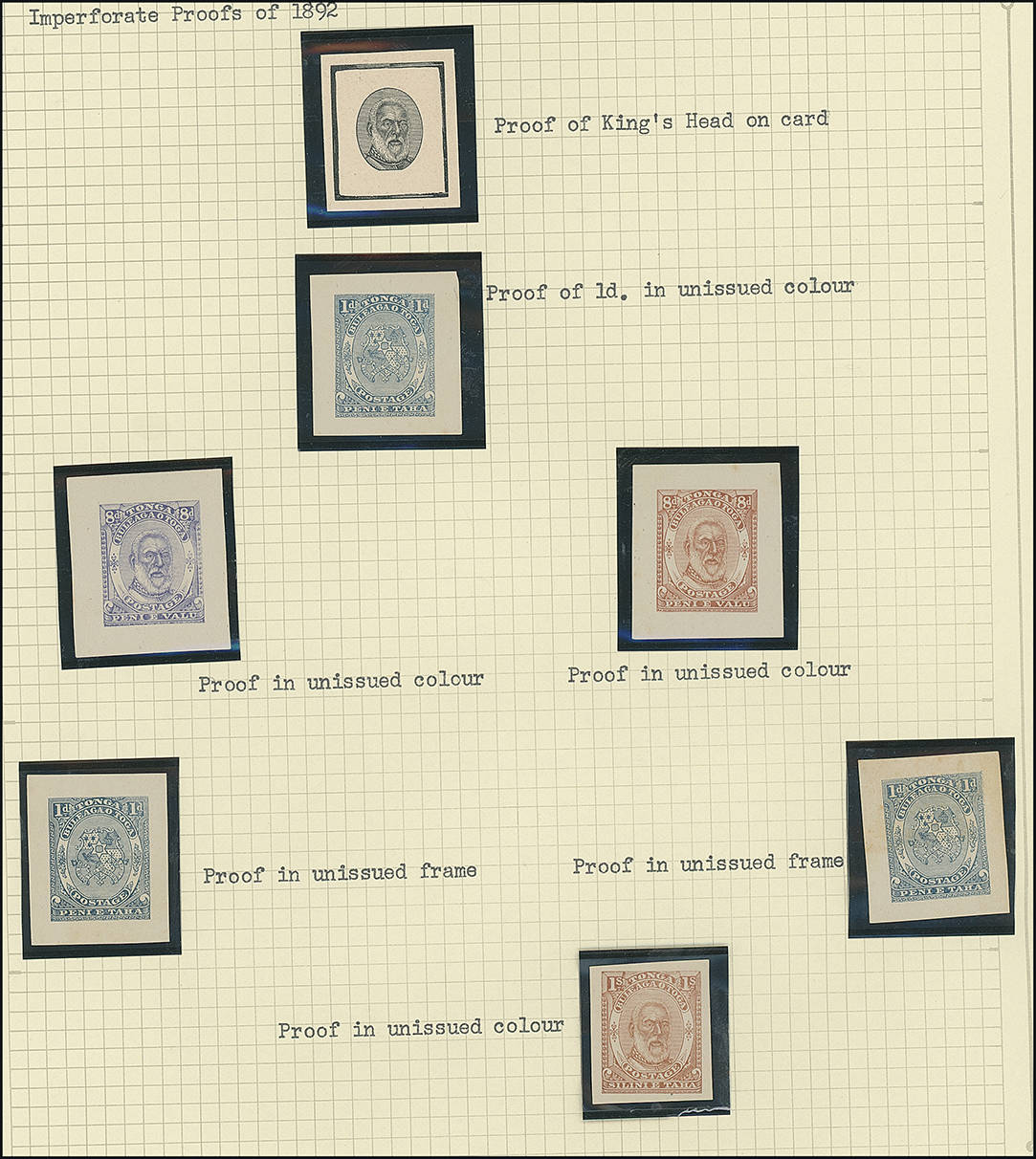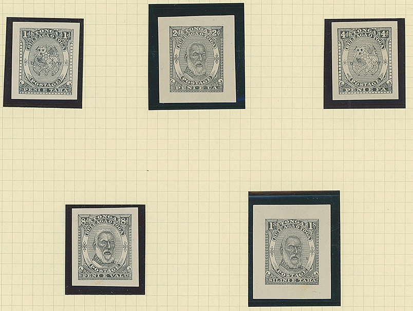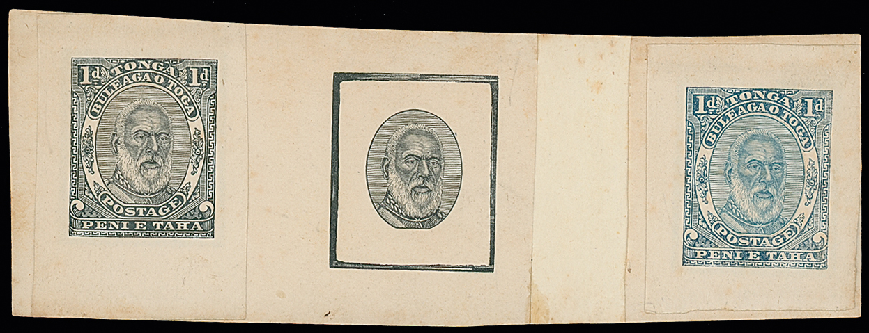 The James Teron Collection of Tonga: 1892 Arms and King George I Issue, Master Die Proof of King George I head vignette with cleared background and rectangular outer frame, also 1d. (3) in blue (3), 8d. (2) in
