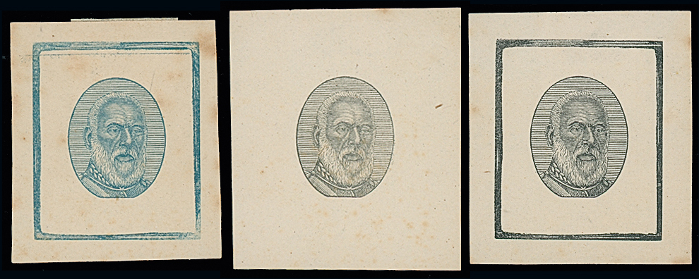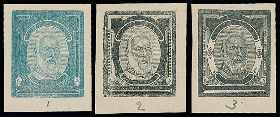 blue, the others in black, all on wove paper, numbered below “1”, “2” and “3” respectively in pencil by the engraver A.E. Cousins. Ex Howard-White and Baxendale. Photo. (Image1)