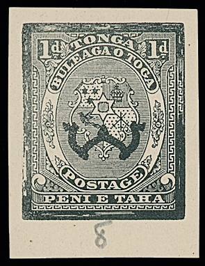 The James Teron Collection of Tonga: 1892 Arms and King George I Issue, Progressive Die Proof of Arms 1d. printed in black on wove paper, with uncleared surround and incomplete Arms, numbered below “8” in pencil
