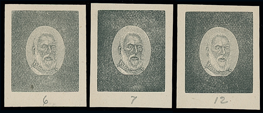 The James Teron Collection of Tonga: 1892 Arms and King George I Issue, three Progressive Die Proofs of the King George I head design with incomplete frames showing progress of engraving, the first printed in