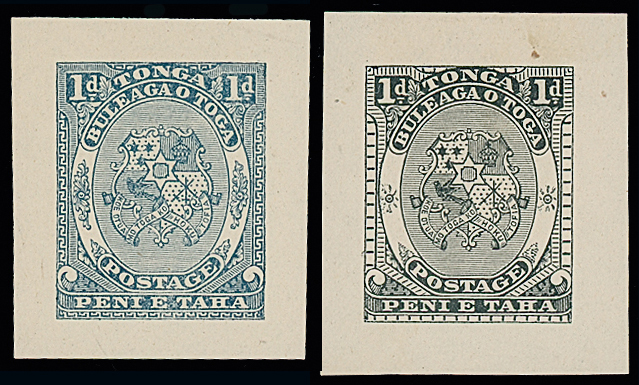 The James Teron Collection of Tonga: 1892 Arms and King George I Issue, Die Proofs of Arms 1d., original design with large side ornaments, proof in black and 1d., amended design with reduced side ornaments, in