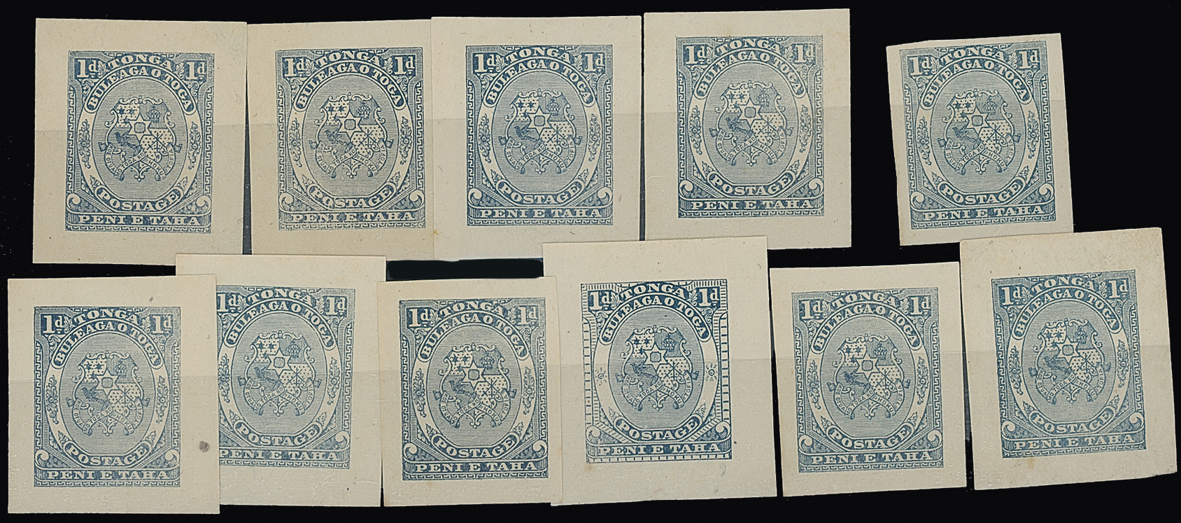 The James Teron Collection of Tonga: 1892 Arms and King George I Issue, Die Proof of Arms 1d., amended design with reduced side ornaments, in blue on wove paper. (11) Photo. (Image1)
