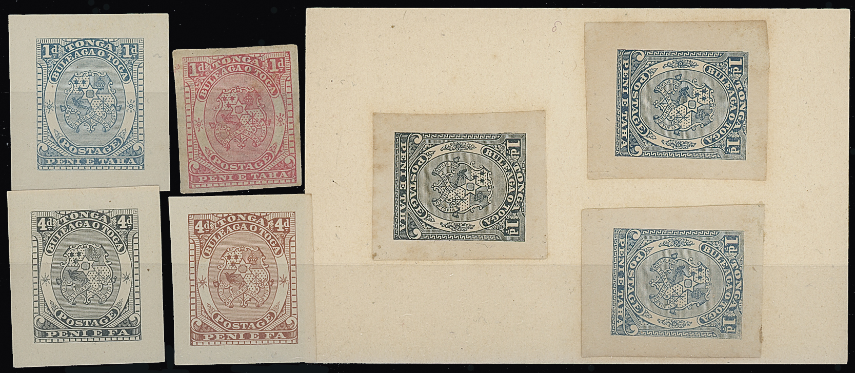 The James Teron Collection of Tonga: 1892 Arms and King George I Issue, Die Proofs of Arms 1d., original design with large side ornaments, proofs in blue, deep blue and red (poor), 4d. in black and brown on wove